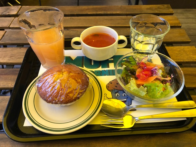 朝食は8種のマフィンから1つ選べる。他にサラダとスープ、くらい。