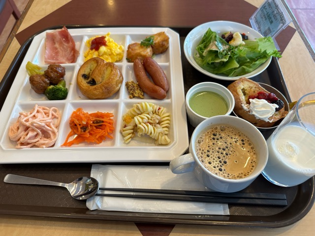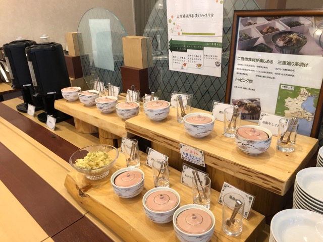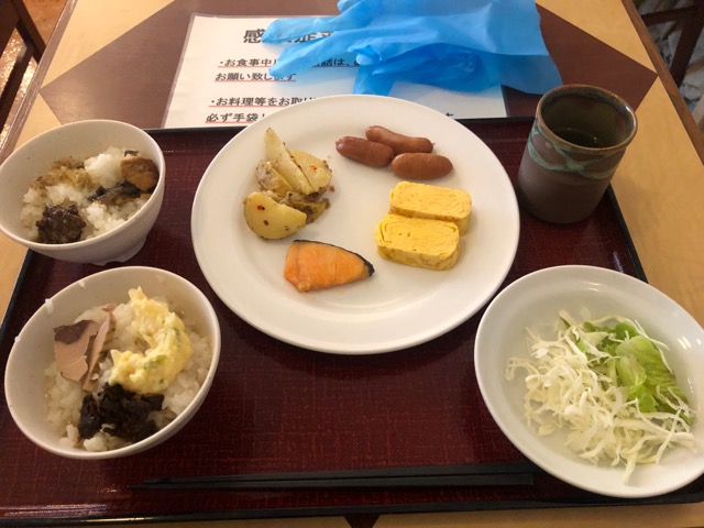 朝食はバイキング、青の手袋が食欲を妨害するが、