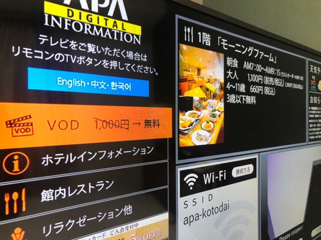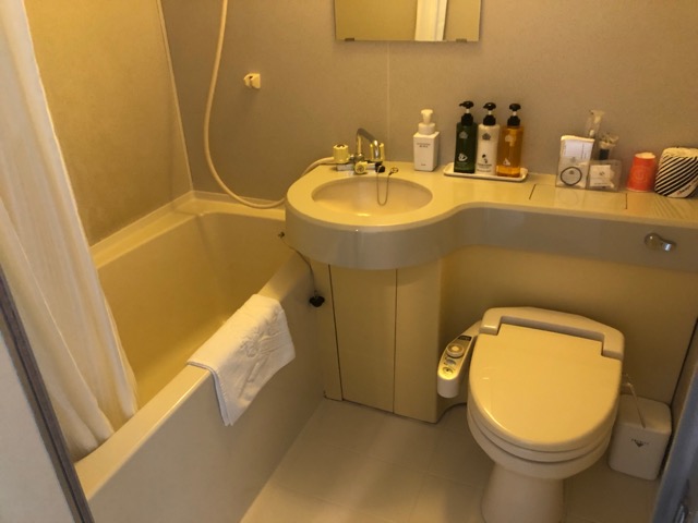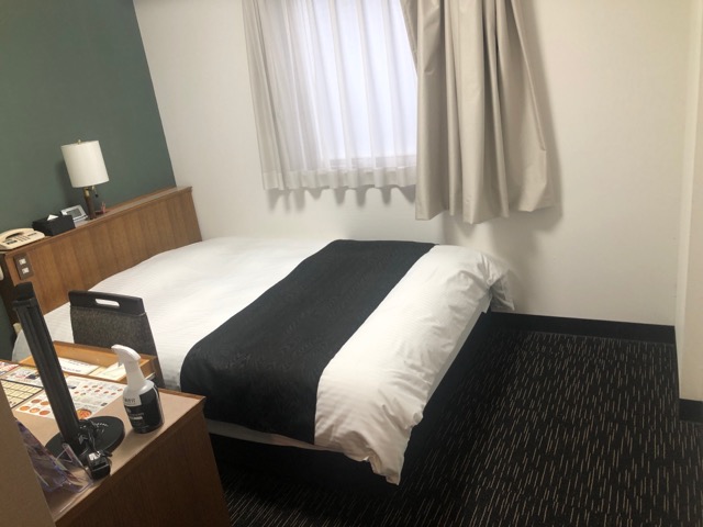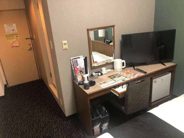 部屋はベッド広く、椅子に座って机に向かうとさすがに狭い。