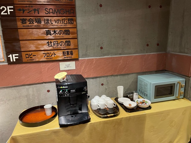 コーヒーは自由に飲める。その脇に水色の電子レンジ。