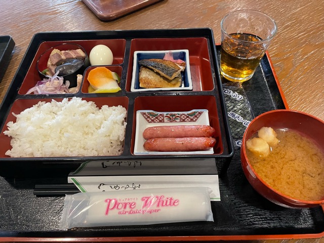 朝食は2階のレストラン。お重にご飯をついでくれる。