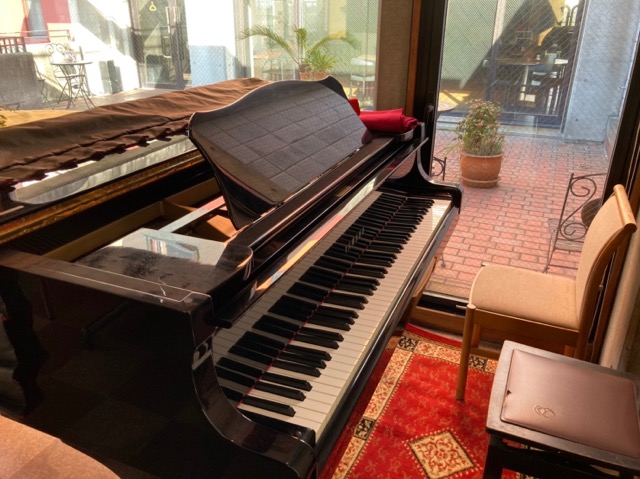 窓から隣の部屋が見える。グランドピアノが置かれてある。
