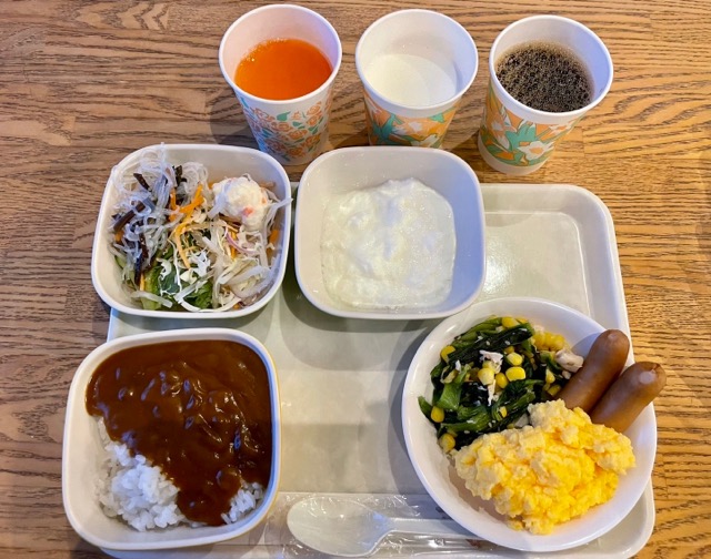 無料朝食、結構充実していた。カレーは甘口。6:30からだけど団体で早く出発するということで6:00オープンにしてくれた。