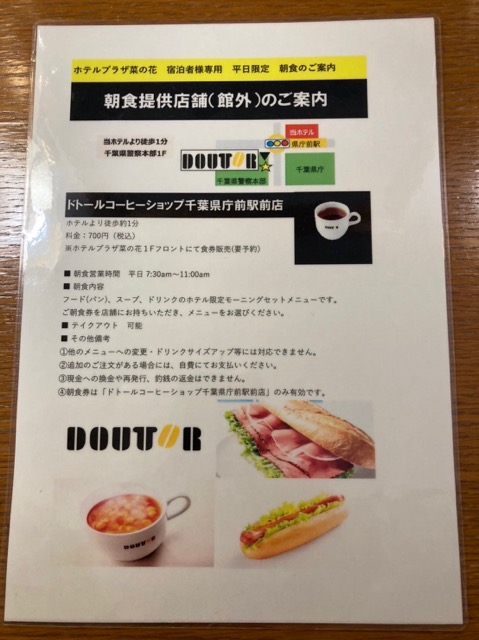 1階にレストランがあったようだけど、閉店している。その影響か、朝食は向かいにある千葉県警内のドトールコーヒーへ。県警に通勤される方々と一緒に歩いて朝ごはんを食べに行くという不思議な感じ。