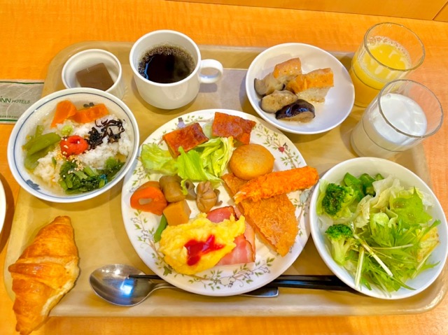 朝ごはん、タンドリーチキンが朝食にしてはけっこうパンチ効いた辛さだったけどお肉やわやわで美味しかった。