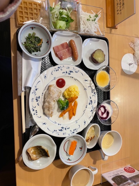朝食、コロナ対策で時間を30分ずつ区切られていてチェックインまでに全泊分の朝食時間が記載された食券を受け取るタイプ。時間どおりに行ったらめちゃくちゃ並んでた。