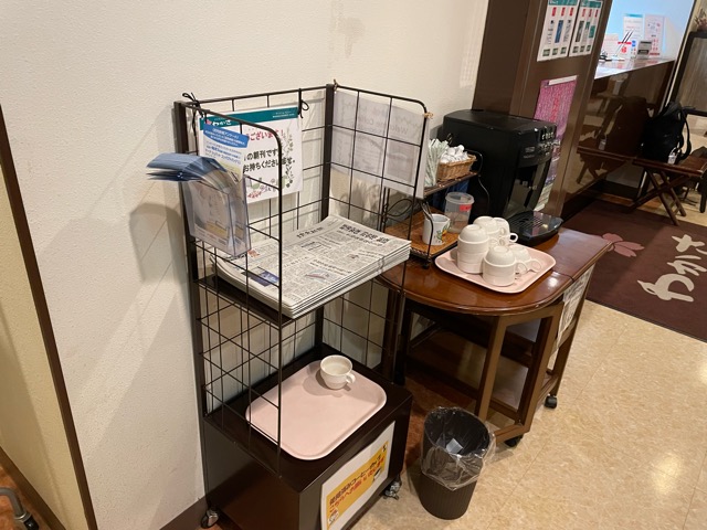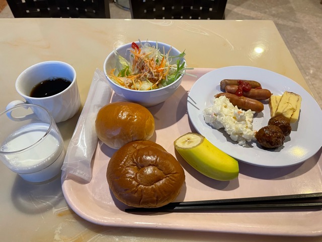 無料朝食つき。1階ロビーで食べる。