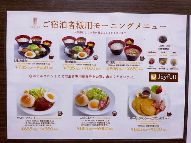 朝食は同じ建物の中のジョイフルで。宿泊者用モーニングセット、和洋各3種類ずつの6種類から選ぶスタイル。ドリンクバーつき。