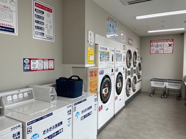 大きめのコインランドリー併設。海水浴した人用のシャワーも外にある。