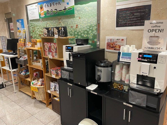 1階ロビーにウェルカムコーヒーコーナーあり。麦茶も。