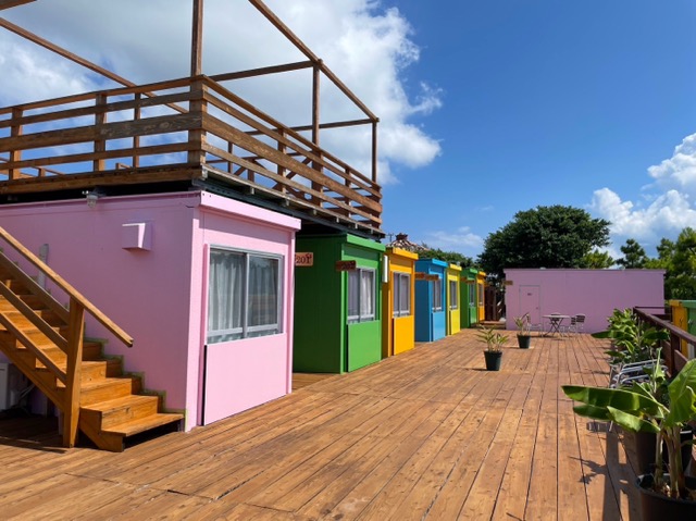 海辺のカラフルなコンテナタイプの部屋が並ぶ宿泊施設。