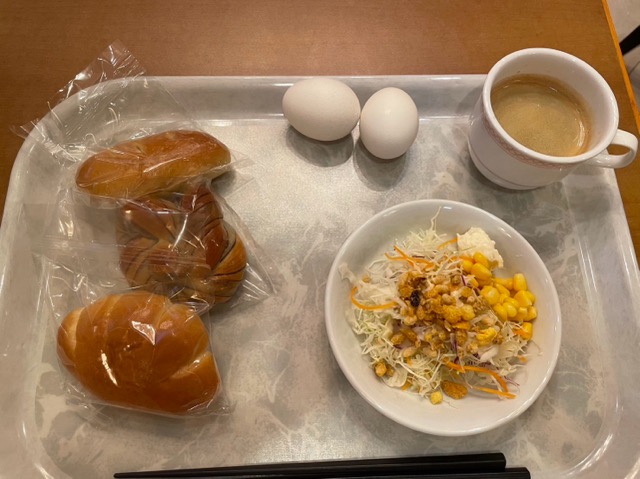 ホテルの雰囲気の割に朝食は質素な感じ。でも甘いパンの種類いろいろあって私は満足。