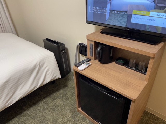 部屋広く、コンセントいっぱいある。ソファで大画面テレビ見られて嬉しい。