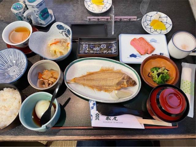 朝食は和食、7時からなので7時に行ったけど、後から出してくれるご飯とお味噌汁以外は冷え冷えで、いつから並べてあるのか気になった。魚がカッチカチで割り箸入らなくて食べるの難易度高い、、でも美味しかった。