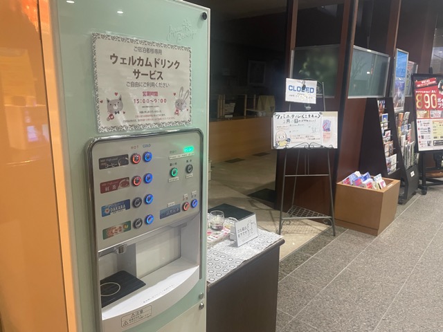 フロント脇にウェルカムドリンク、紅茶にリンゴジュース混ぜて飲んだ。