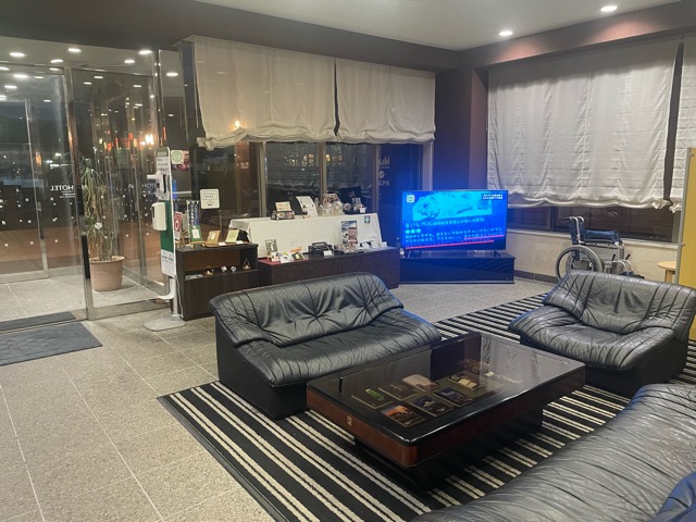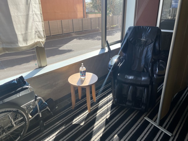 ロビー窓際パーテーション向こうにマッサージ機が置かれてある。無料。