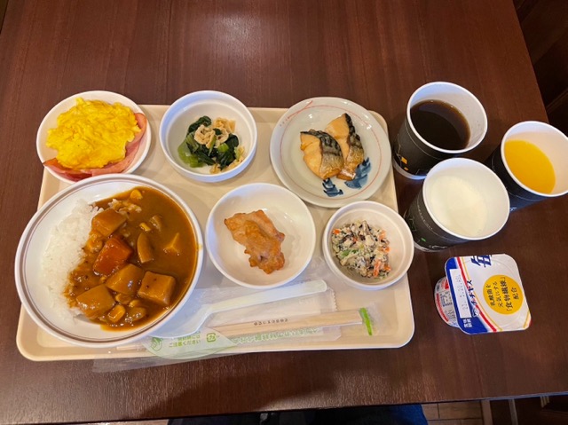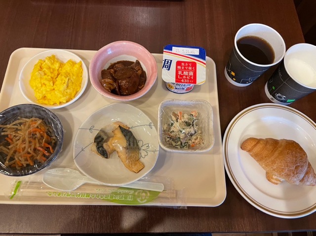朝食、トレイと一緒にワンプレートタイプの四角い大きいお皿があるから取ってしまうけど、食べ物はだいたい小鉢に入れて置いてあるので困り果てる。