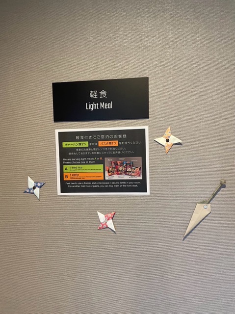 朝食(というかいつ食べても良い軽食、という扱い)冷凍食品のやつだった。パスタ3種と炒飯3種からひとつ選ぶスタイル。飲み物はフリー。