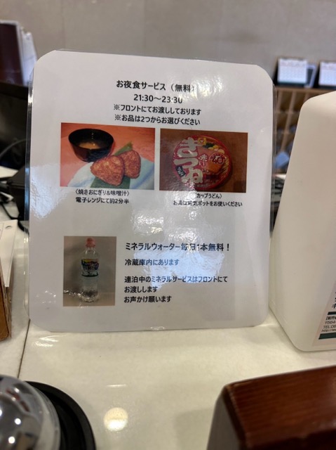 無料夜食に赤いきつねのカップうどんか、焼きおにぎり2個と味噌汁が選べる。