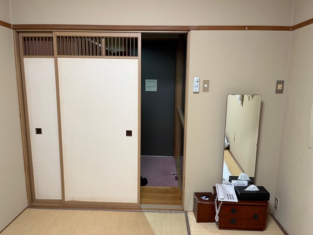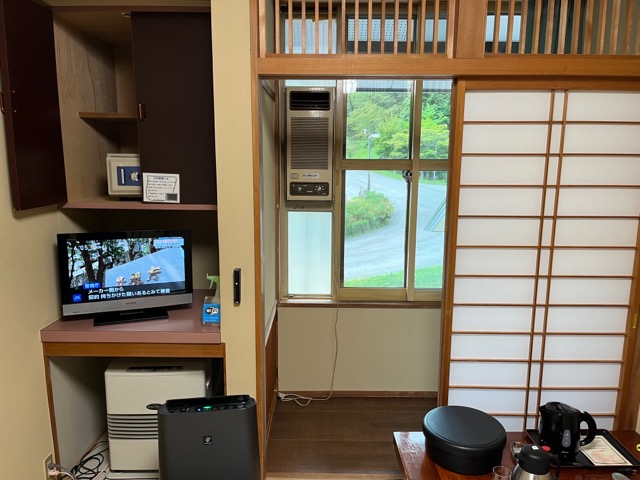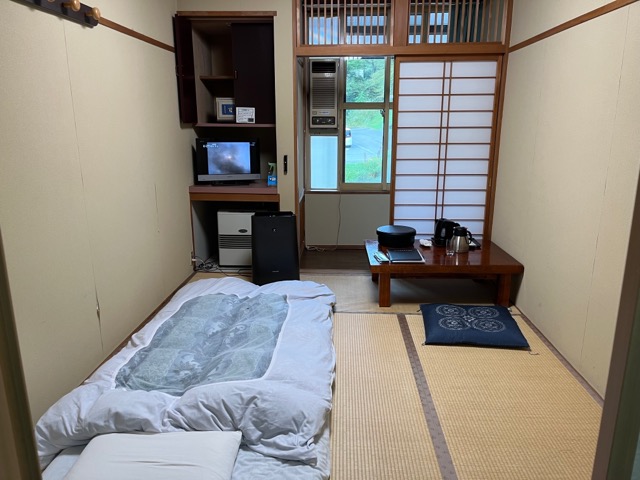 布団と浴衣にタオルセット。個室に水場はない。冷水ポットと、電気ケトルは部屋に用意されている。
