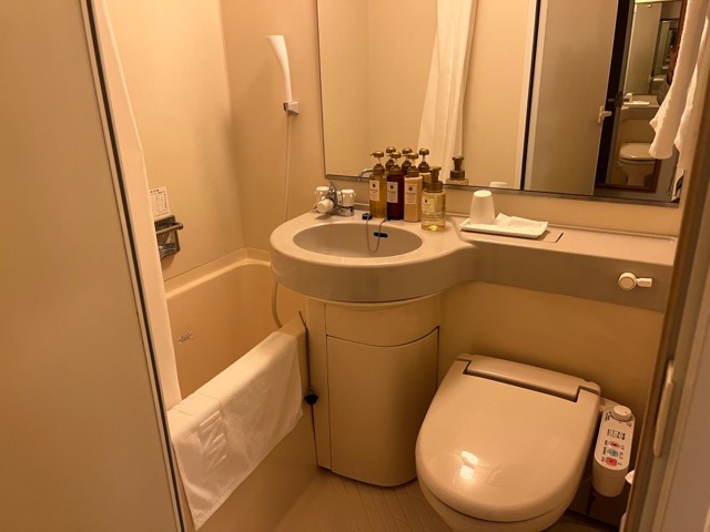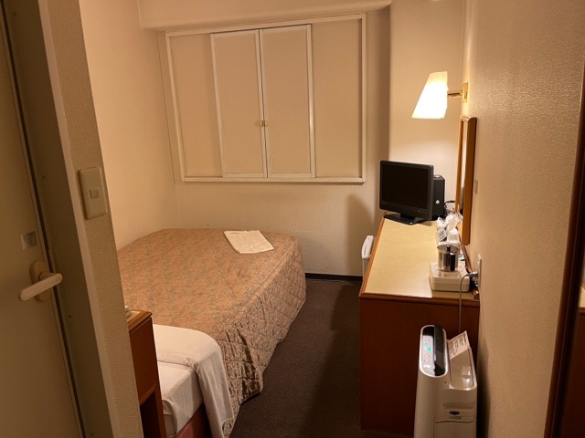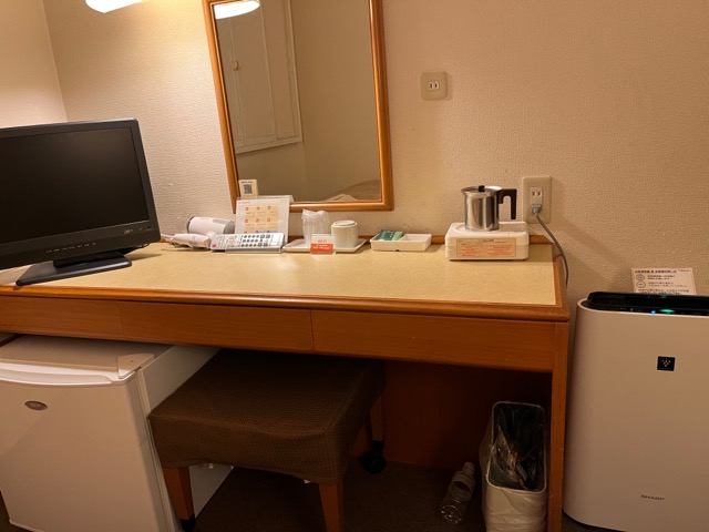 部屋はよくあるビジネスホテルタイプだか、廊下幅や浴室内は何となく広め。壁や浴槽はそれなりの経年劣化がある。加湿空気清浄機プラズマクラスター設置あり。