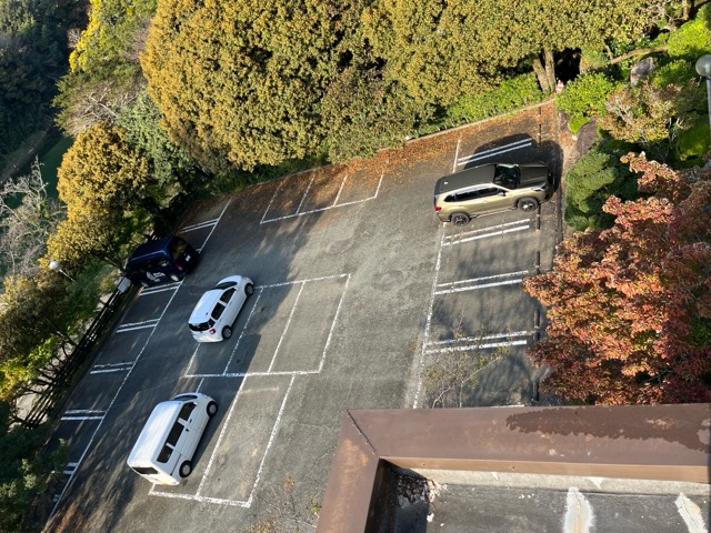 駐車場広大。100台無料。2トン車の駐車場はホテル6階に通じている。