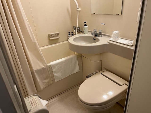 古いビジネスホテルで部屋は狭めだけれど、フロントはしっかりしている。