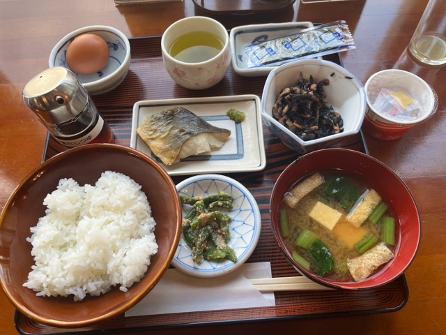 朝食は前日に「和」「洋」を選択。地元の食材を使った定食。それにプラスどちらを選んでもカレー(おかわりご飯)や納豆、コーヒー、ジュースはバイキングコーナーから選んで食べられる。