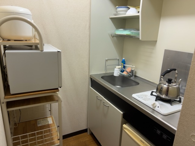お部屋にキッチンがあり、電子レンジなどもあるので便利そう。