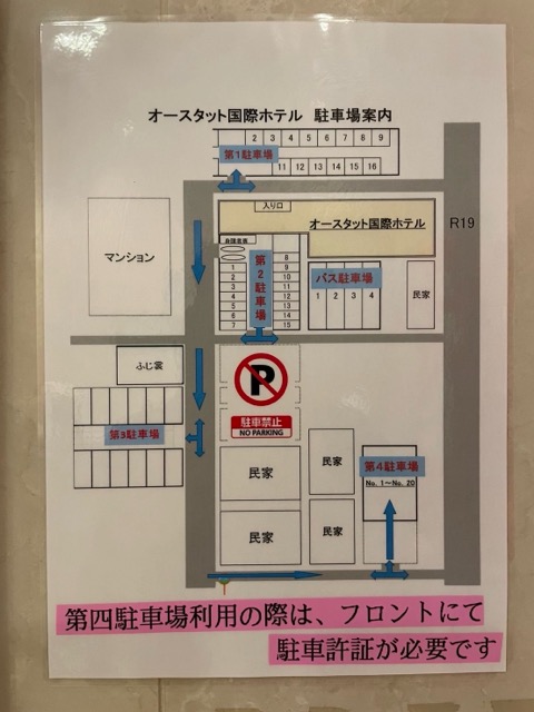 今回は困ることなく入れられたけど、他の車が停まっているところに入れるのは大変かもしれない道幅。ちなみにバス駐車場に行くには19号から左折で入るのが正解(セカンドストリート越えたらすぐの道)。そこ以外の道はもっと狭いので注意。