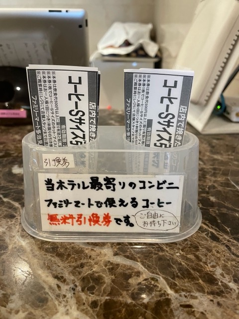 ファミマが徒歩3分ほど。このファミマで使えるコーヒー無料券がフロントに常備されている。