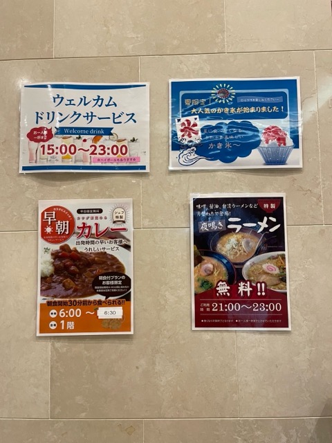アメニティは種類豊富だし、ウェルカムドリンクがあったり夜鳴きラーメンがあったり、なんだか賑やかな印象。