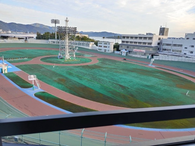 ホテルの部屋から競輪場と海が見える。