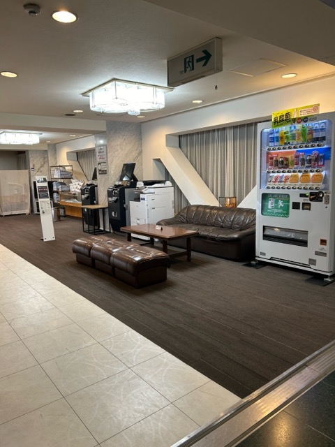 会場が混み合った時に使うのか、エレベーターホールあたりに会議室のような机と椅子がある。2階の客室に行くにはそこを通り抜けていかなければならず、不思議なレイアウト。