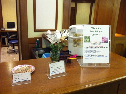 ラウンジにはフレッシュハーブティーのコーナーが!書いてある通りに入れてみたら白湯ができました。きっと私のやり方が悪いのだ。