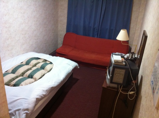 部屋にはでかでかとソファーが。一人だと荷物置きくらいにしかならない、ごめんなさい。